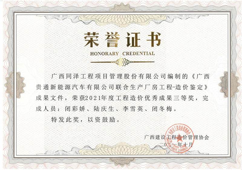 《廣西貴通新能源汽車廠房造價鑒定項目》榮獲2021年度工程造價優秀成果三等獎