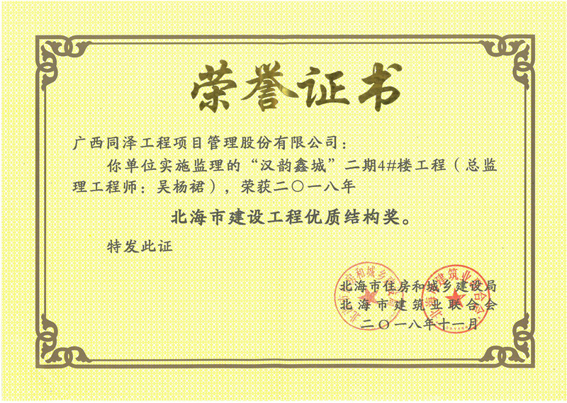 漢韻鑫城二期4#樓工程項目榮獲2018年度“建設工程優秀結構獎”