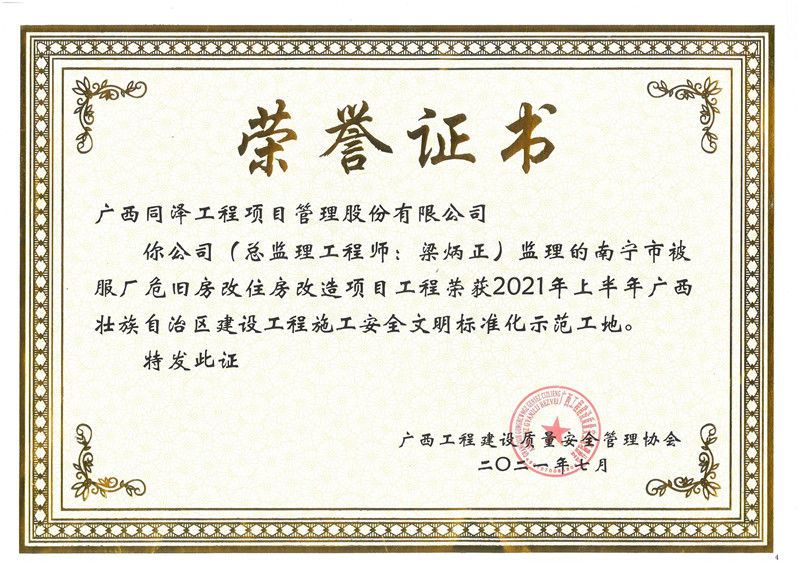 南寧市被服廠危舊房改住房改造項目榮獲2021年度安全文明標準化工地