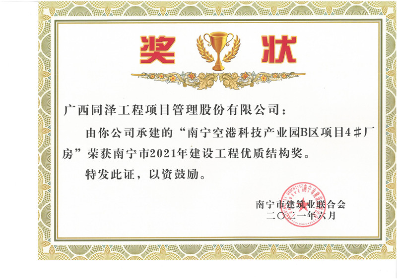 南寧空港科技產業園B區4#廠房項目榮獲2021年度建設工程優質結構獎