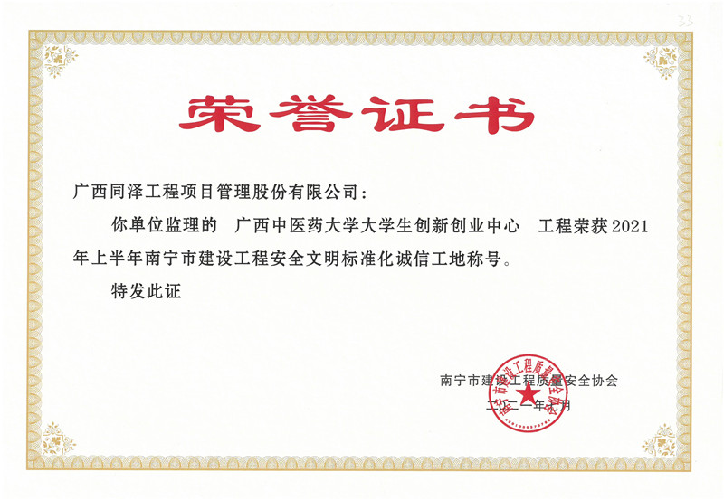 廣西中醫藥大學實訓樓項目、大學生創新創業中心項目榮獲2021年度安全文明標準化工地