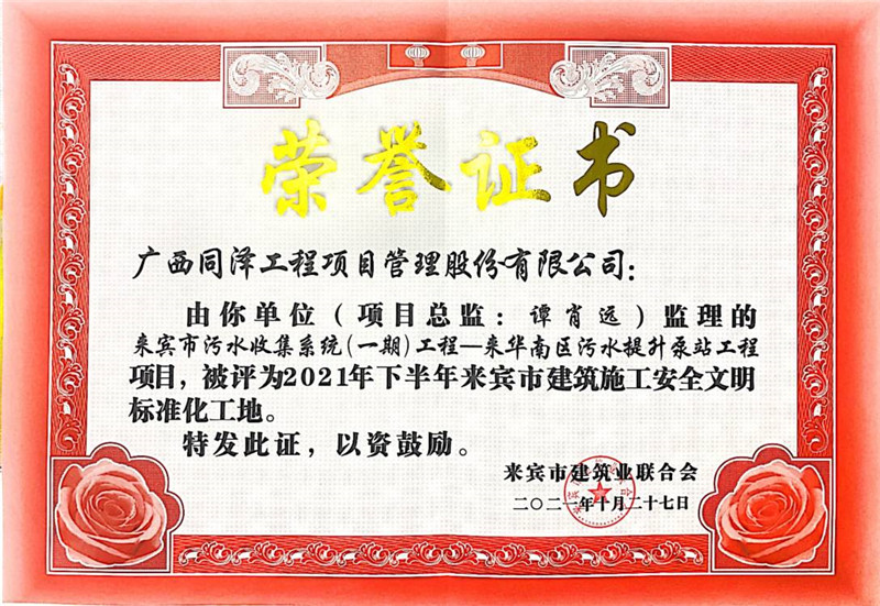 來賓市污水收集系統(一期)工程——來華南區污水提升泵站工程榮獲2021年度安全文明標準化工地