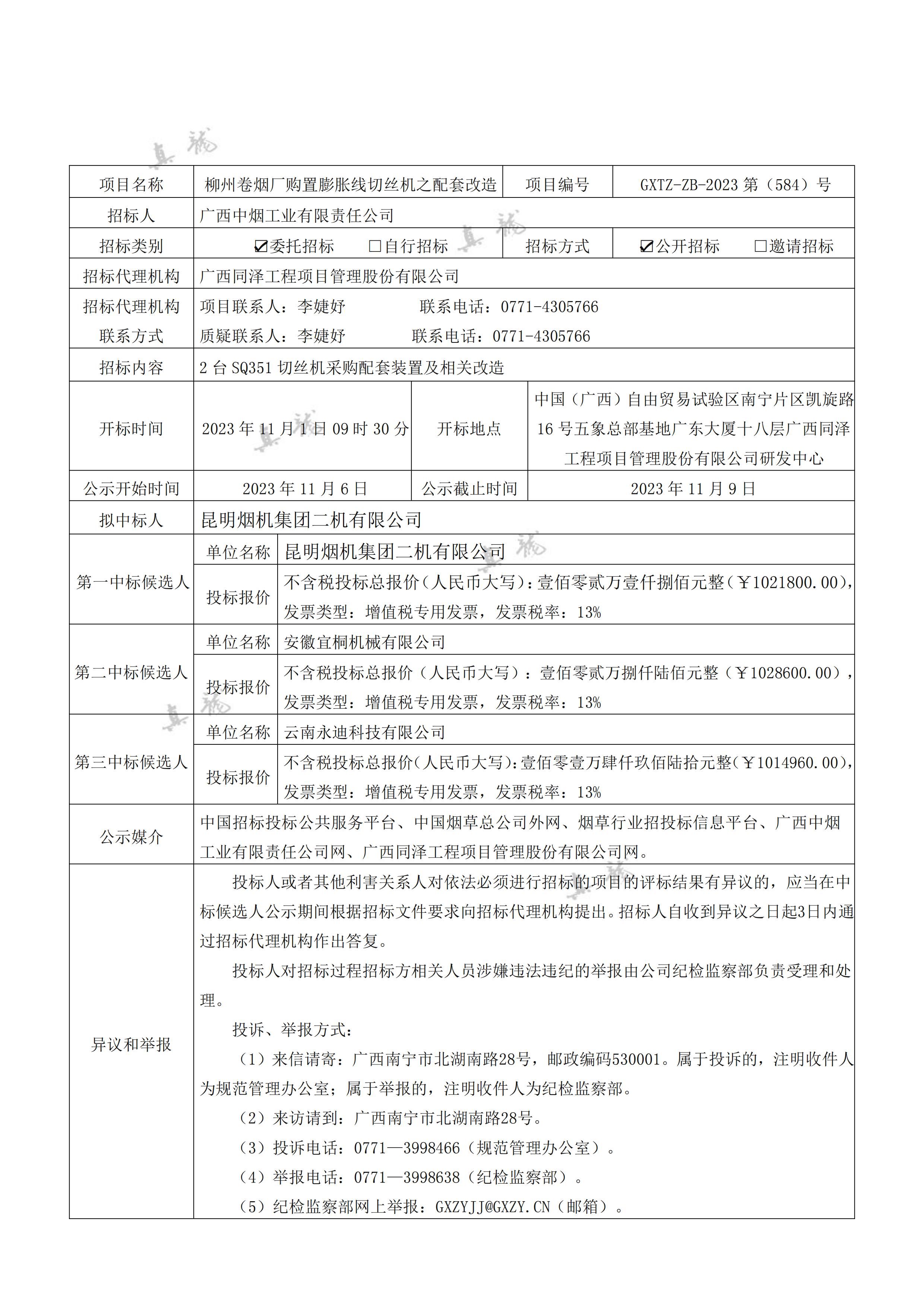 廣西中煙工業有限責任公司柳州卷煙廠購置膨脹線切絲機之配套改造(項目編號:GXTZ-ZB-2023第(584)號)中標候選人公示