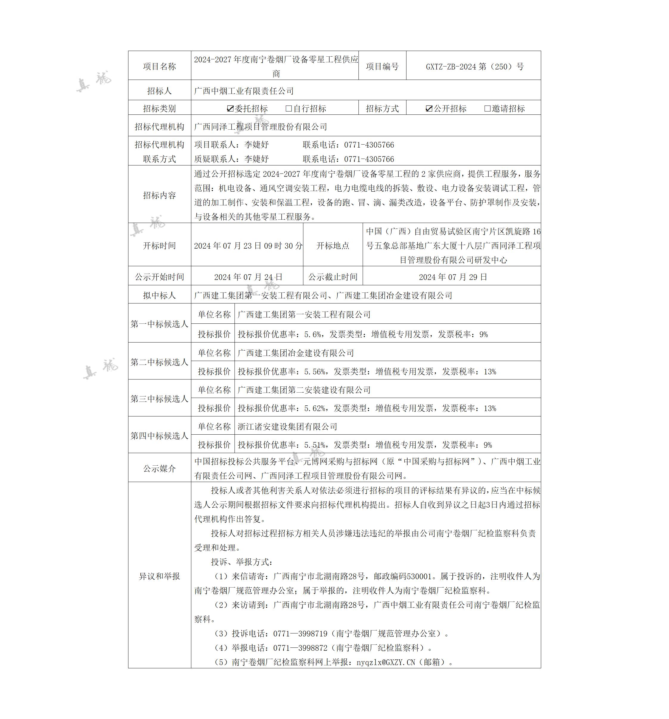 廣西中煙工業(yè)有限責(zé)任公司2024-2027年度南寧卷煙廠設(shè)備零星工程供應(yīng)商(項目編號:GXTZ-ZB-2024第(250)號)中標候選人公示