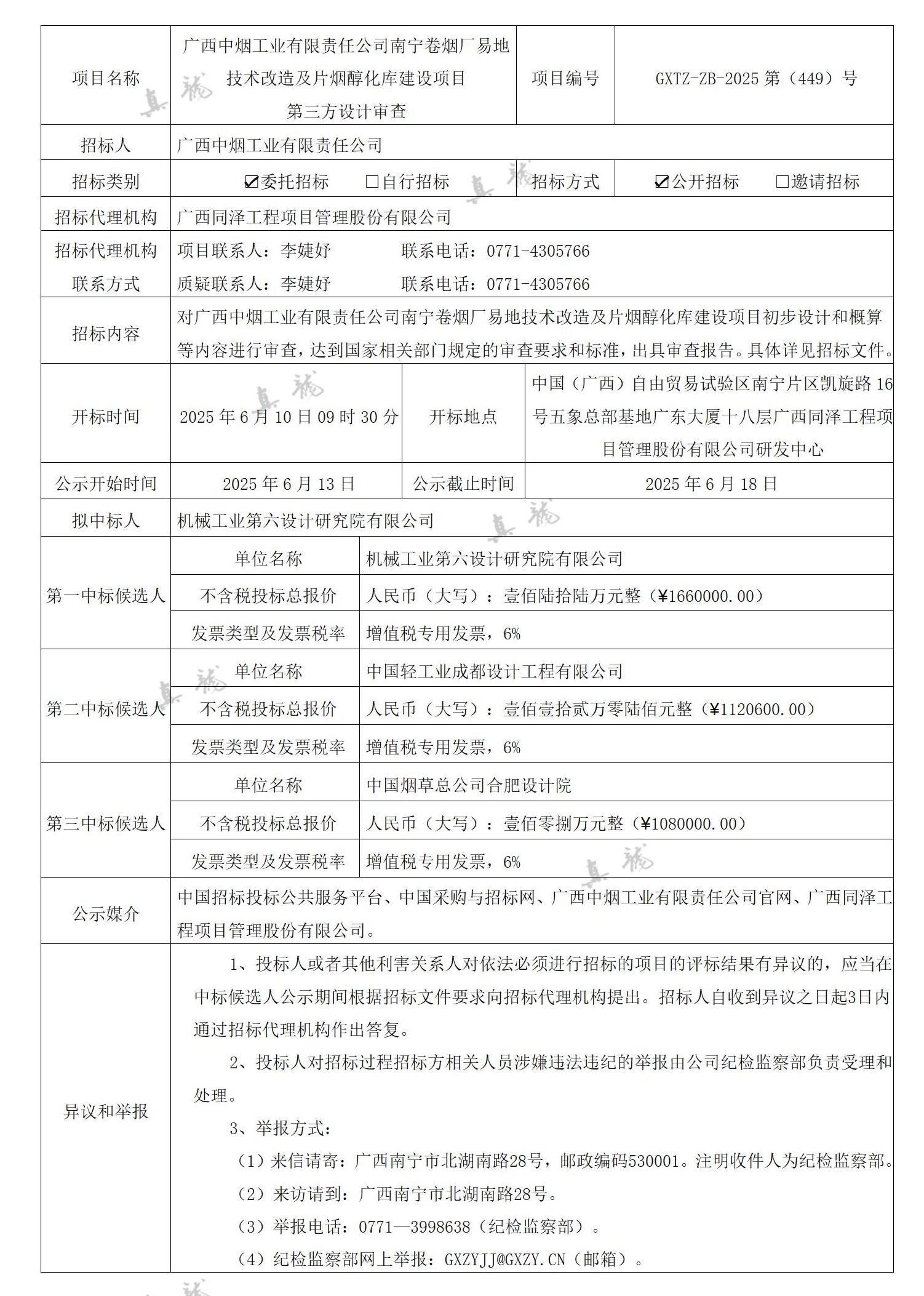 廣西中煙工業有限責任公司南寧卷煙廠易地技術改造及片煙醇化庫建設項目第三方設計審查(項目編號:GXTZ-ZB-2025第(449)號)中標候選人公示